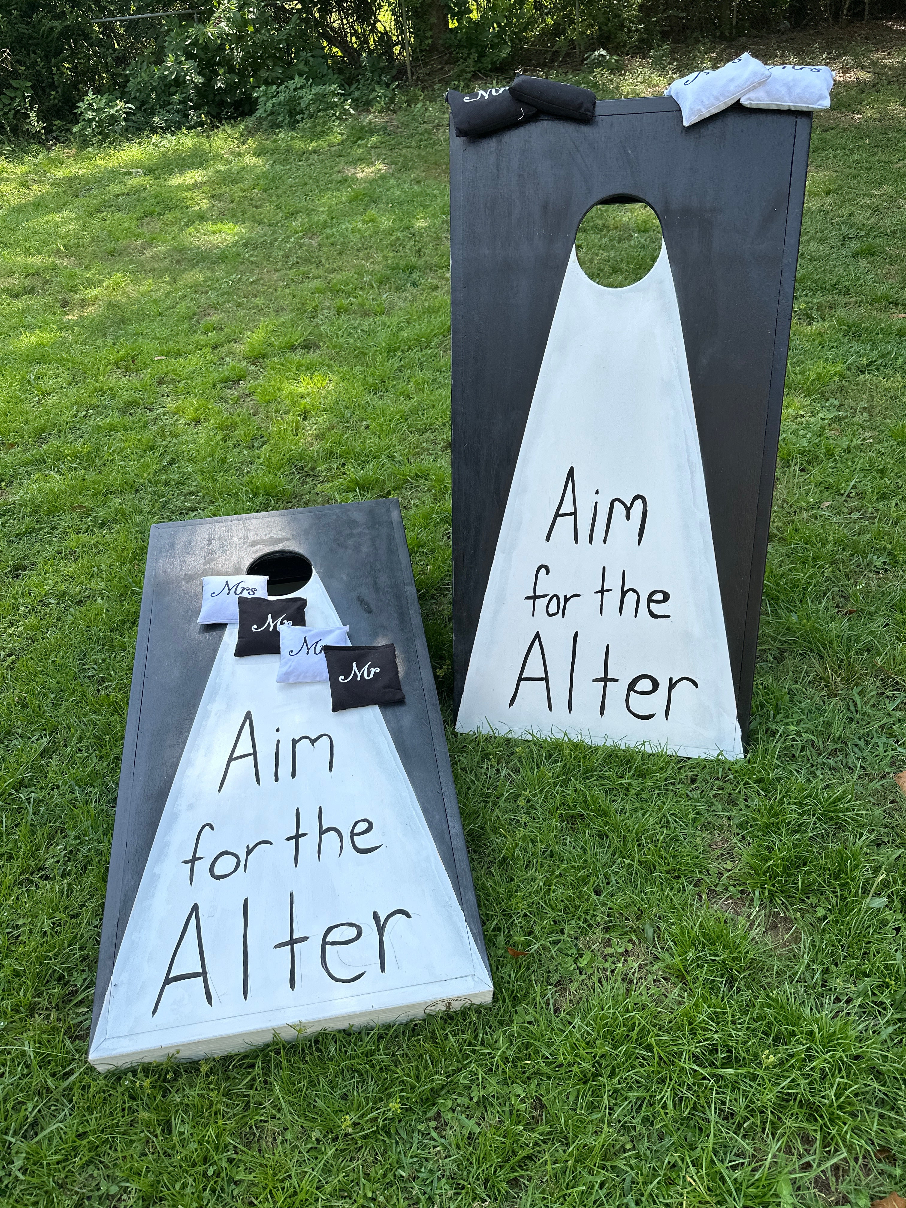 You took your aim and found true love! Now it's time to celebrate that perfect shot with "Aim for the Altar," our beautifully handcrafted cornhole set. This quintessential lawn game is a playful tribute to finding your target and starting a new life together, making it a perfectly themed addition to your special day.