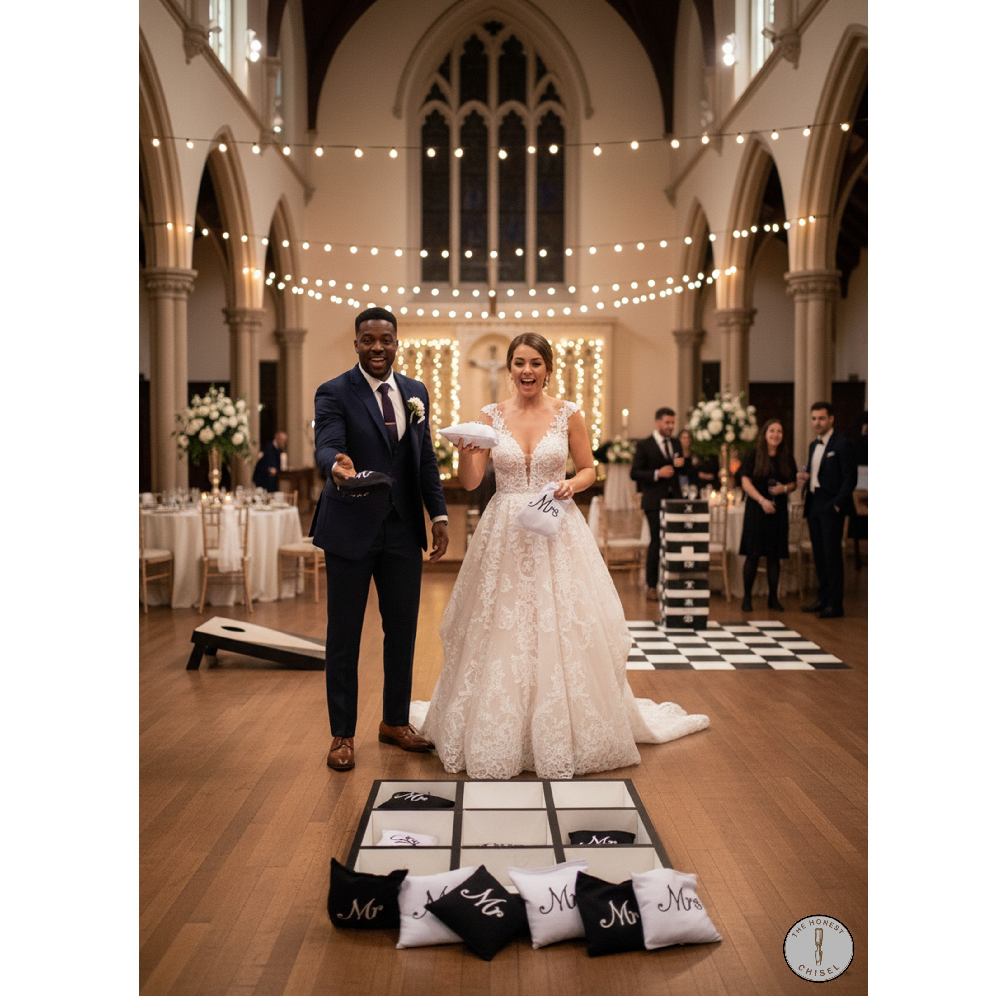 A Battle of the Newlyweds: Our custom 'Mr.' and 'Mrs.' bean bags add a touch of playful romance and friendly competition to every toss.