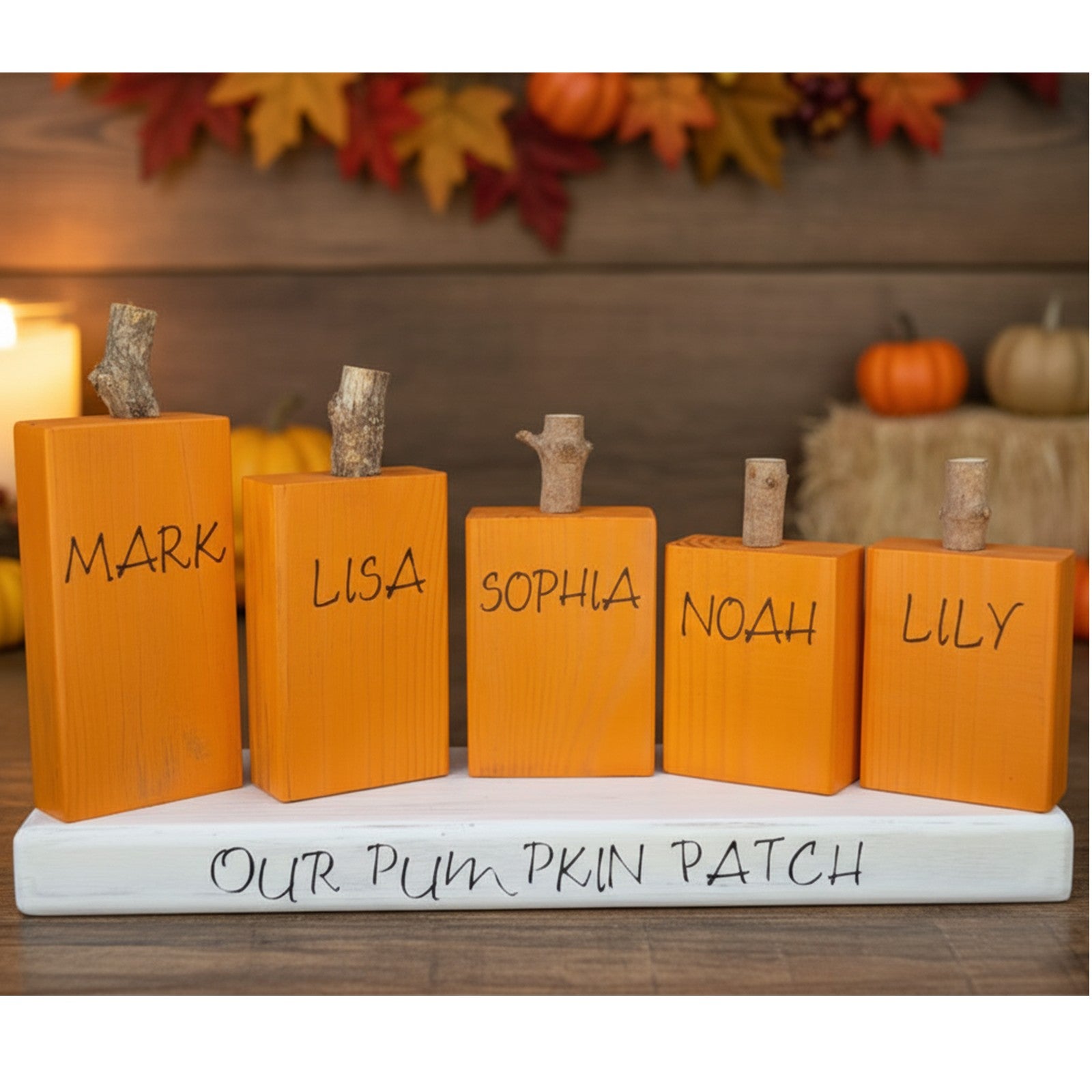 Showcase your favorite ghouls and goblins with our Family Pumpkin Patch, a charming and personalized centerpiece for the autumn season. This delightful set features up to five rustic wooden pumpkins, each customizable with a name of your choice, all nestled on a sturdy whitewashed base declaring "Our Pumpkin Patch." It’s the perfect way to represent your entire family, even the furry, four-legged members! Each pumpkin is topped with a natural branch stem, adding to its authentic, rustic charm. Ideal for a mantel, entryway table, or as a thoughtful gift, this keepsake is a wonderful way to celebrate your unique bunch all season long.