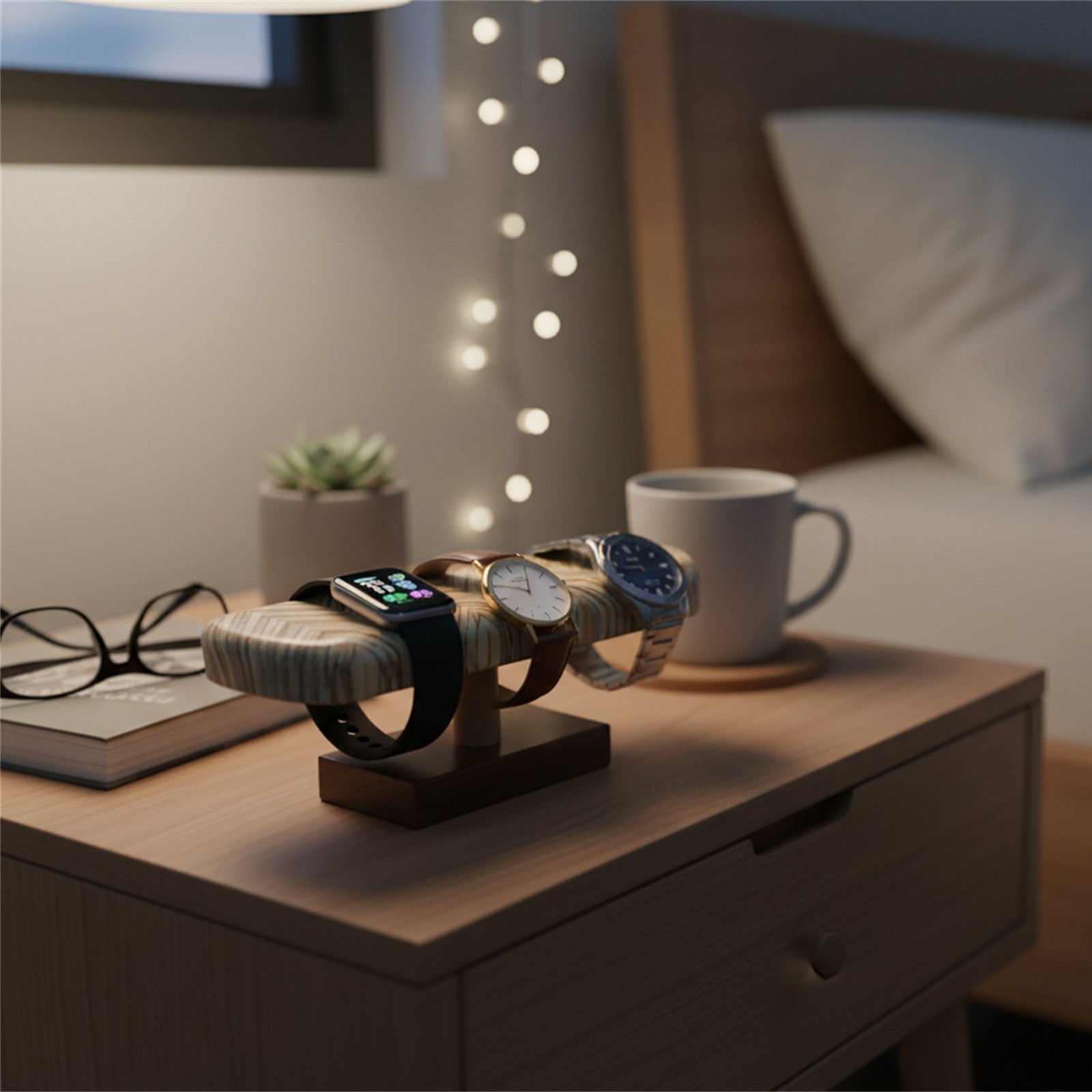 Built to accommodate up to four watches, the stand keeps them organized, accessible, and safe from scratches. The robust design is anchored by a solid hardwood base, offering you a choice between the rich, deep tones of Walnut or the clean, bright elegance of Maple to perfectly match your personal style and decor.