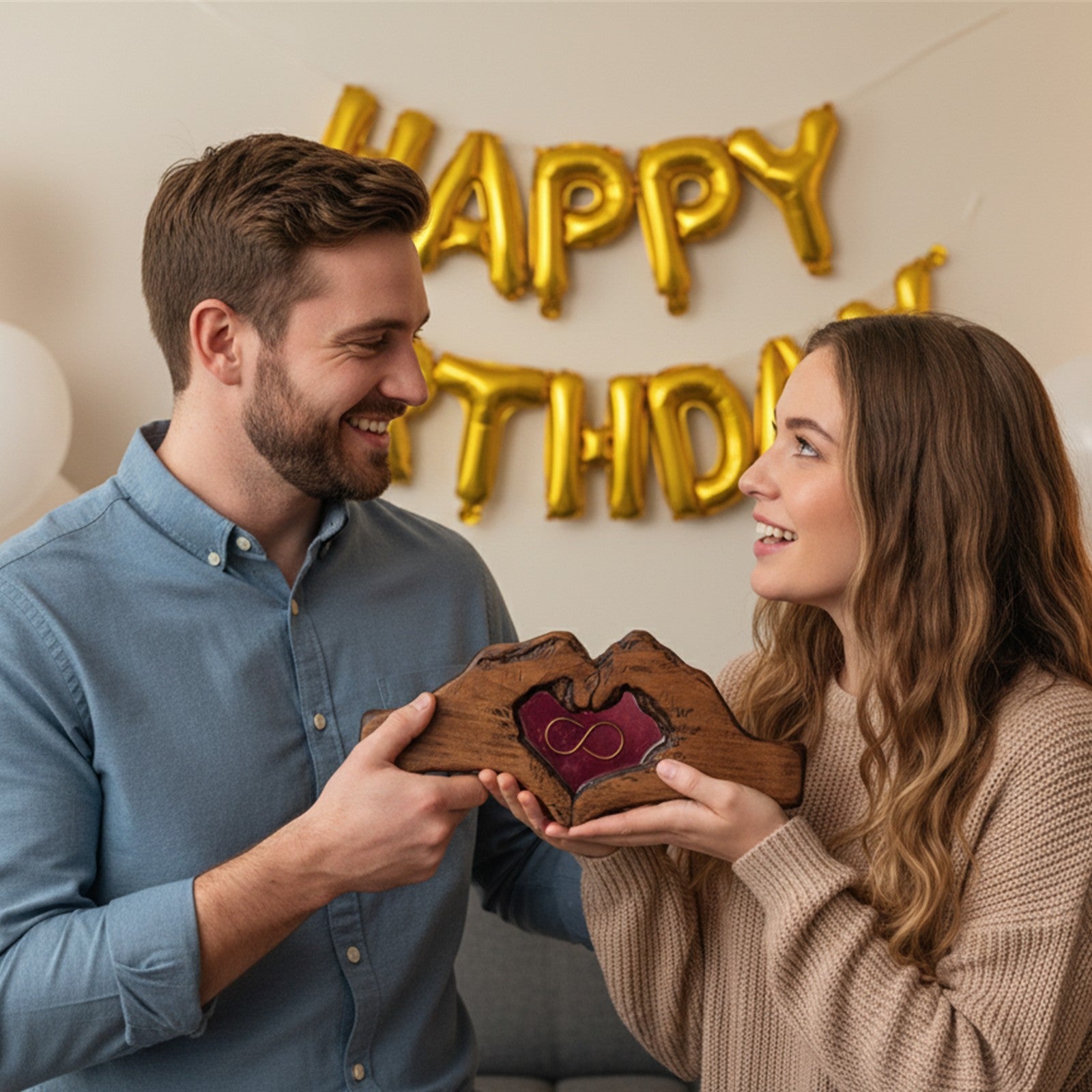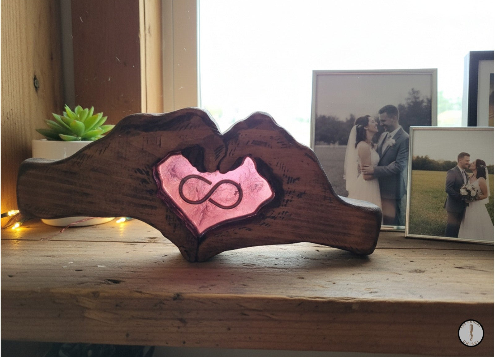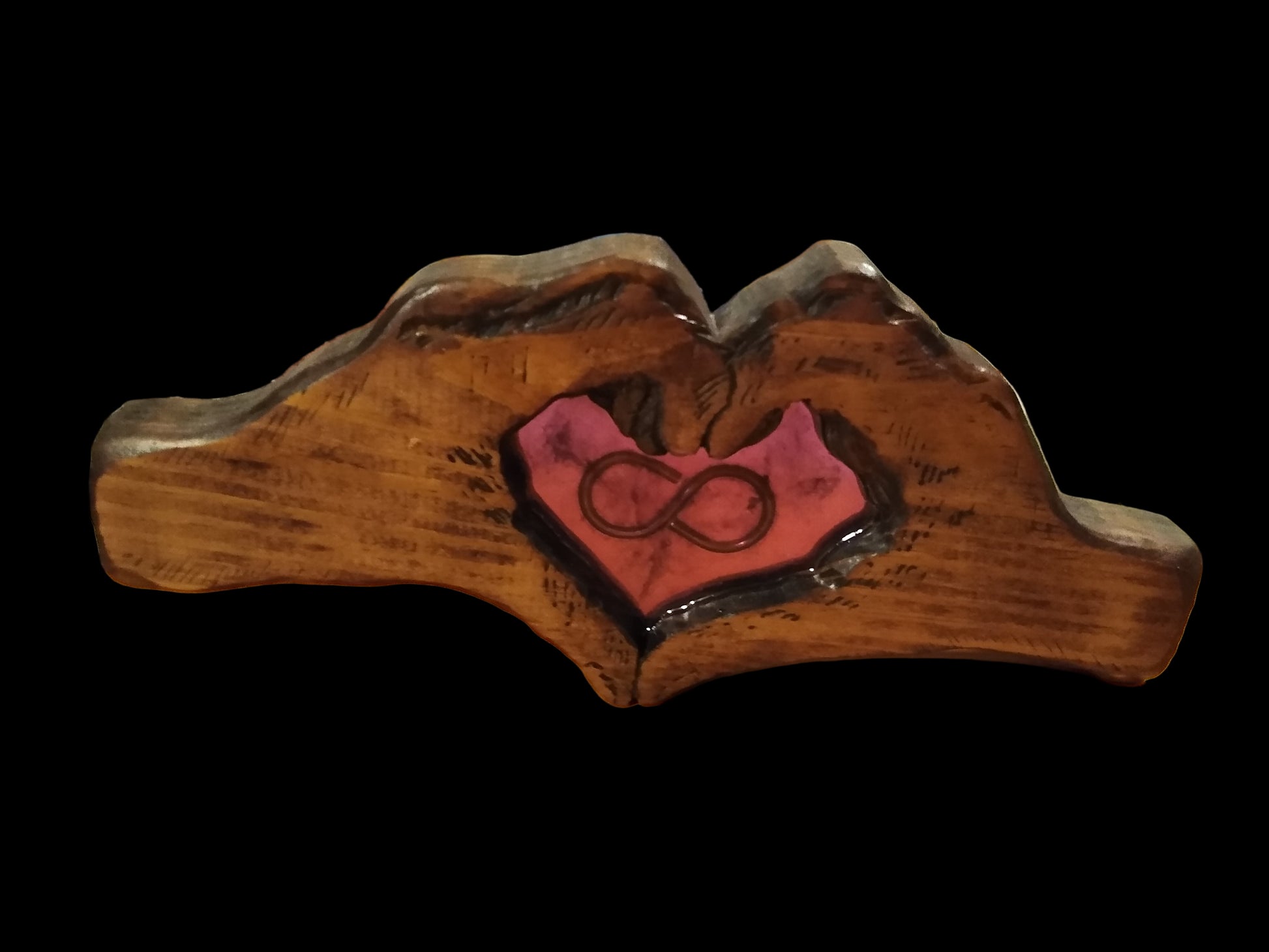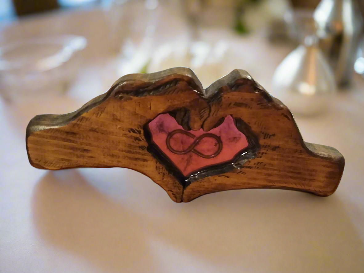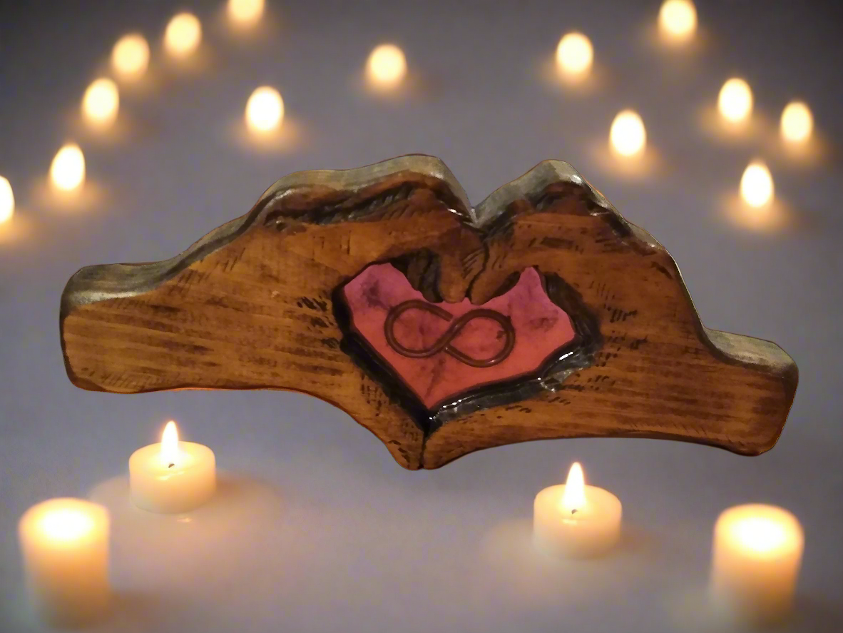 Celebrate an unbreakable connection with the Hands of Love Sculpture, a deeply personal and handcrafted piece from The Honest Chisel. This unique wooden artwork beautifully depicts hands forming a heart, cradling a vibrant resin inlay that features a timeless infinity symbol. Every detail is customizable to tell your unique story: choose from a spectrum of resin colors and select a finish in your preferred wood tone as this sculpture serves as a powerful testament to enduring love, friendship, or family, making it an extraordinary gift or a treasured focal point in your home.