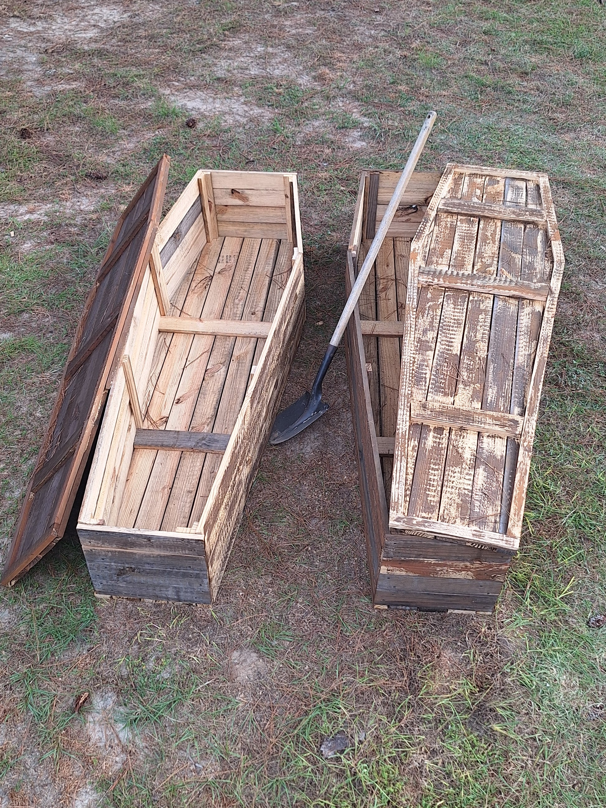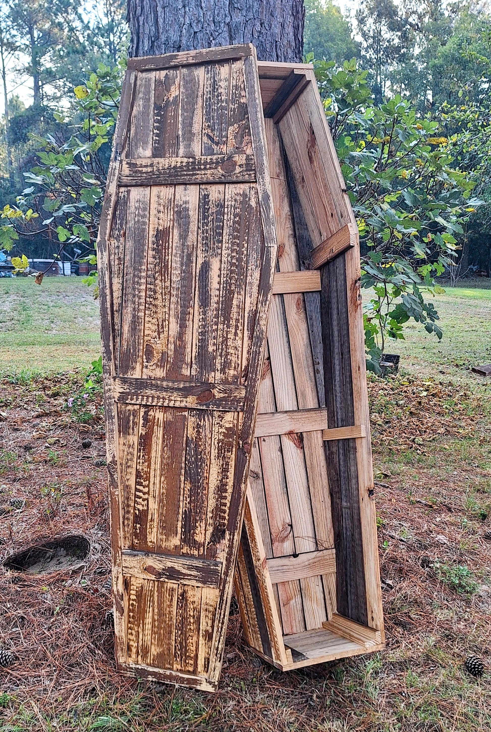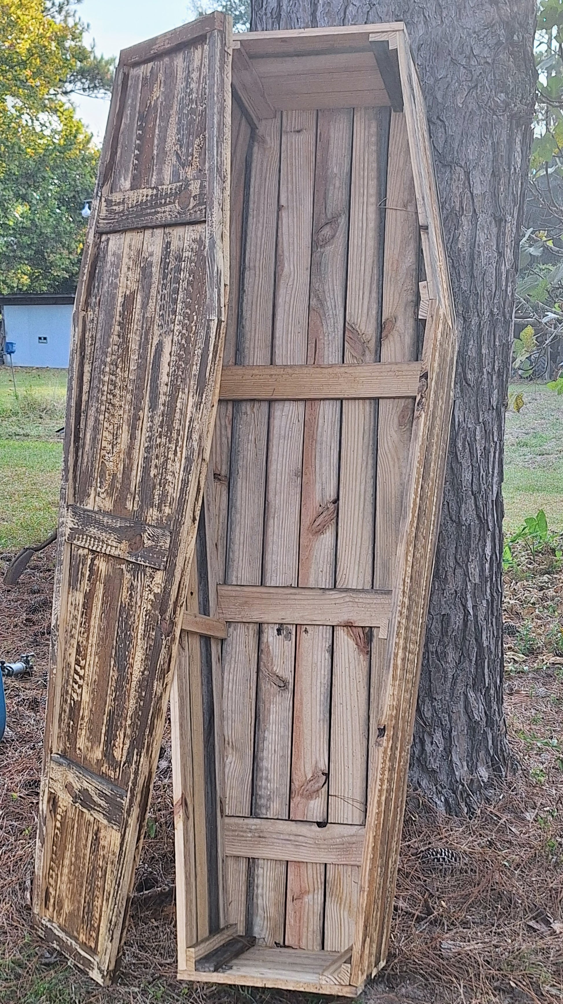 Make a chillingly bold statement with the Rustic Crypt Coffin, the ultimate centerpiece for any serious Halloween or gothic display. This life-sized, 6'9" tall coffin is built in the classic "toe-pincher" style, evoking tales of the Old West and haunted crypts. Each one is constructed from solid wood and features a heavily distressed, weathered finish that looks authentically ancient, as if it were just unearthed.