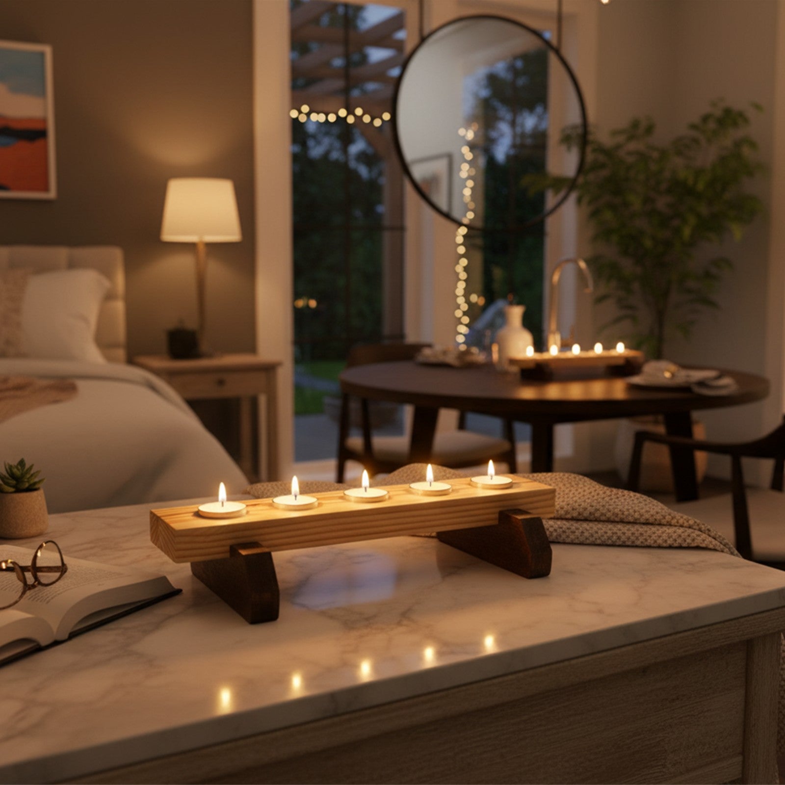 The main plank, which holds five standard tea lights, rests gracefully on two sturdy, contrasting feet. This elevated "bridge" design lifts the candlelight, creating a beautiful play of light and shadow that enhances the ambiance of any space.