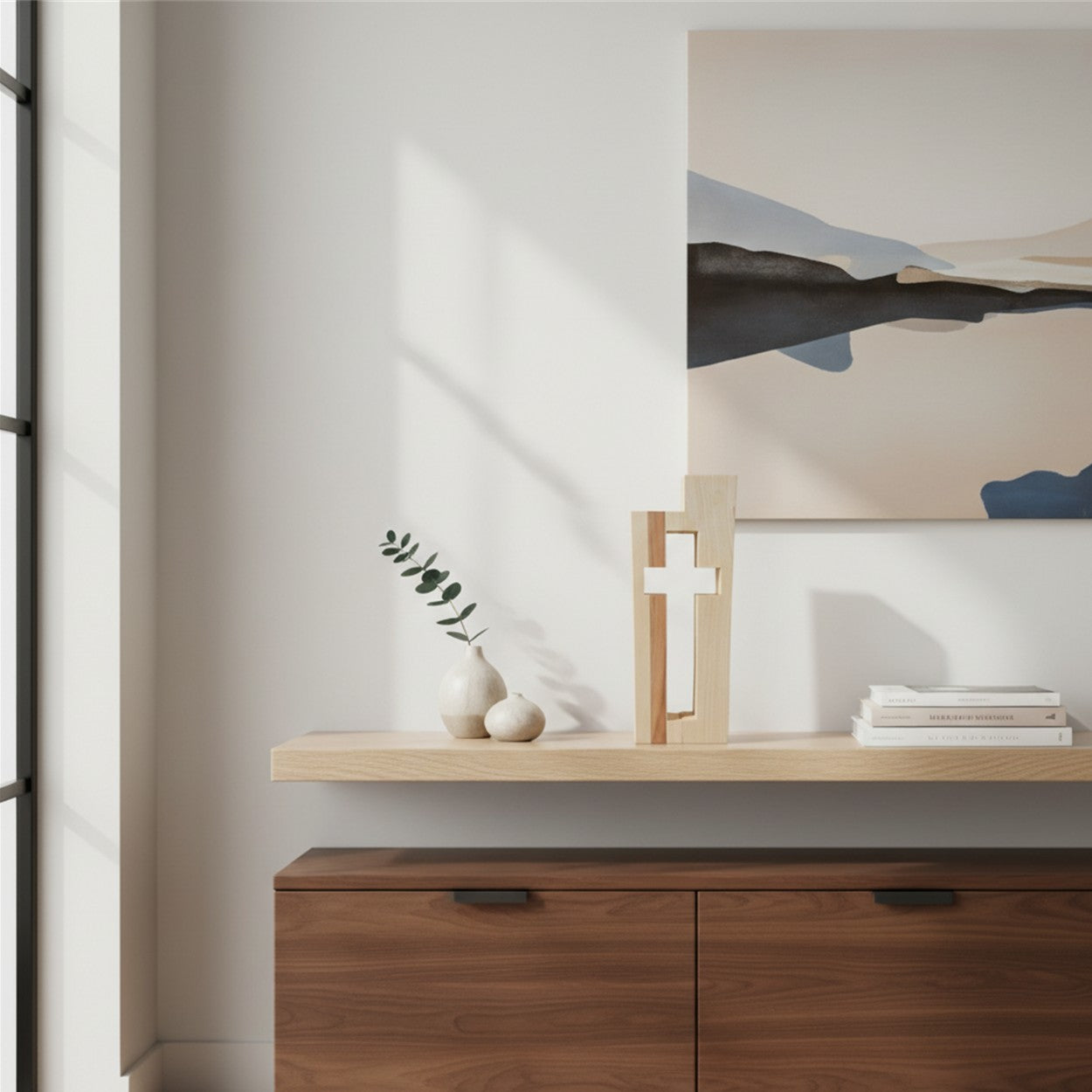 Perfect for a mantel, bookshelf, or modern shelf display, this piece serves as a tasteful and constant reminder of faith. It’s a meaningful gift for housewarmings, baptisms, holidays, or as a quiet statement of belief in your own home.