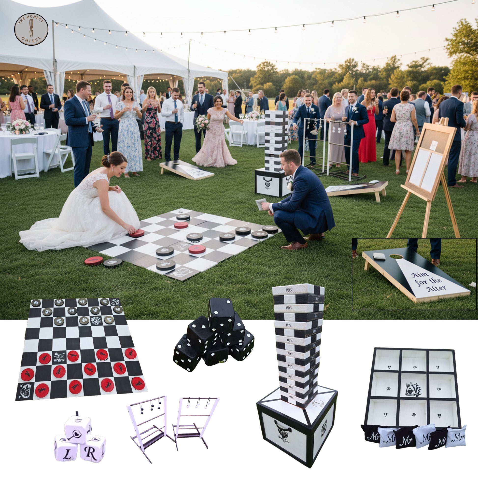 Make your wedding reception truly unforgettable with a curated collection of our signature lawn games. The Honest Chisel offers all-inclusive rental packages designed to bring joy, laughter, and a touch of rustic elegance to your special day.